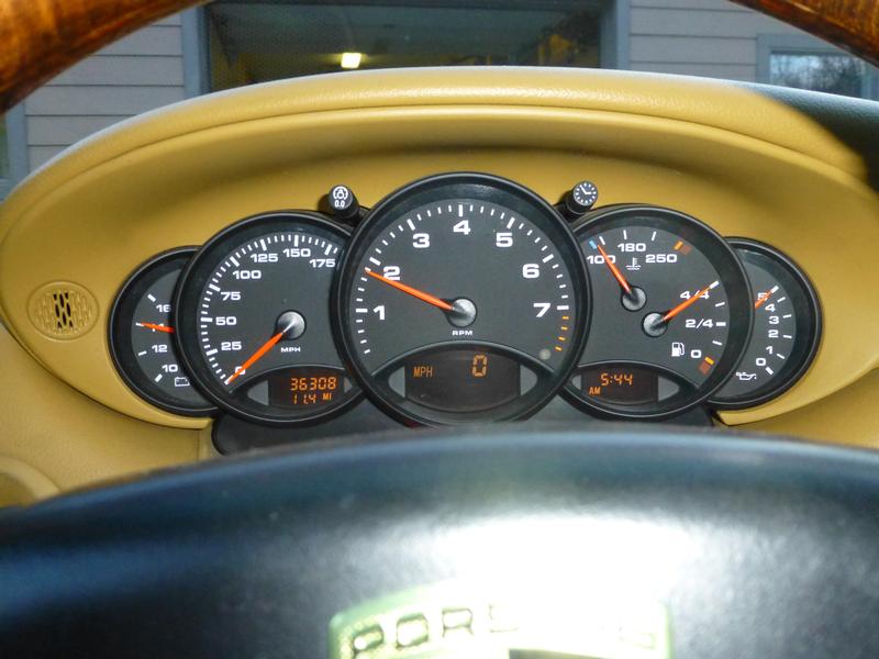 2000 Porsche 911 6 speed Cabriolet with only 36,400 miles. Six speed stick trans, with 300 HP on for this Porsche weighing only, 3200 pounds. Good speed rated tires on black 19″ aftermarket rims. Body, top and interior are in excellent condition. The car is a great color combo of metallic dark blue with Savannah leather interior and the optional interior deluxe wood trim. Recent service work included new engine air intake boots, motor mounts, plugs and coils, and oil and all filters ($2600 in receipts). The car is ready to drive and enjoy top-up or top-down. The car was built in Nov of 1999, so it should have the much more reliable 2-row IMS bearing, as compared to later single row bearings. Recent examination of the oil filter and magnetic drain plug indicate no metal particles. There are no oil leaks or other mechanical problems. The paint is in very good condition and was recently ceramic coated. A few light stain spots are noted on the driver seat, and the driver’s airbag indicates not working, but another airbag to be included in sale. The car has a “salvage” title due to a fender bender back in July 2013, which required replacement of a rear fender, but the repair work was properly done and not noticeable. A current CarFax is available, showing all ownership and service on record over the years.